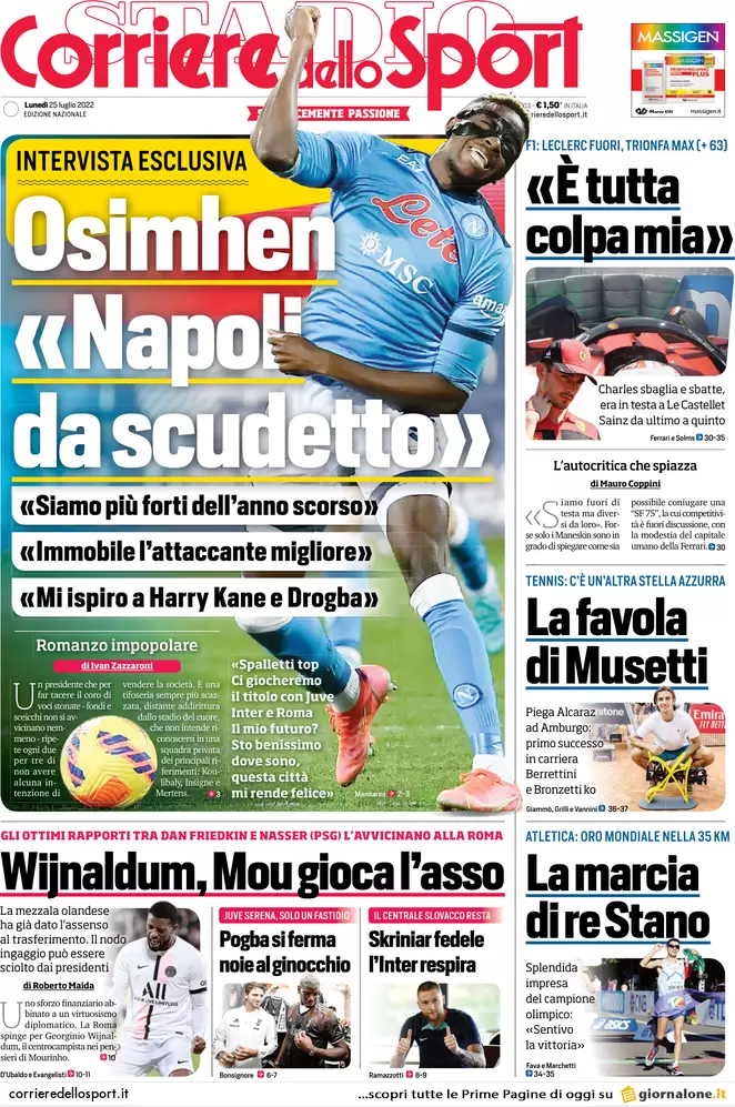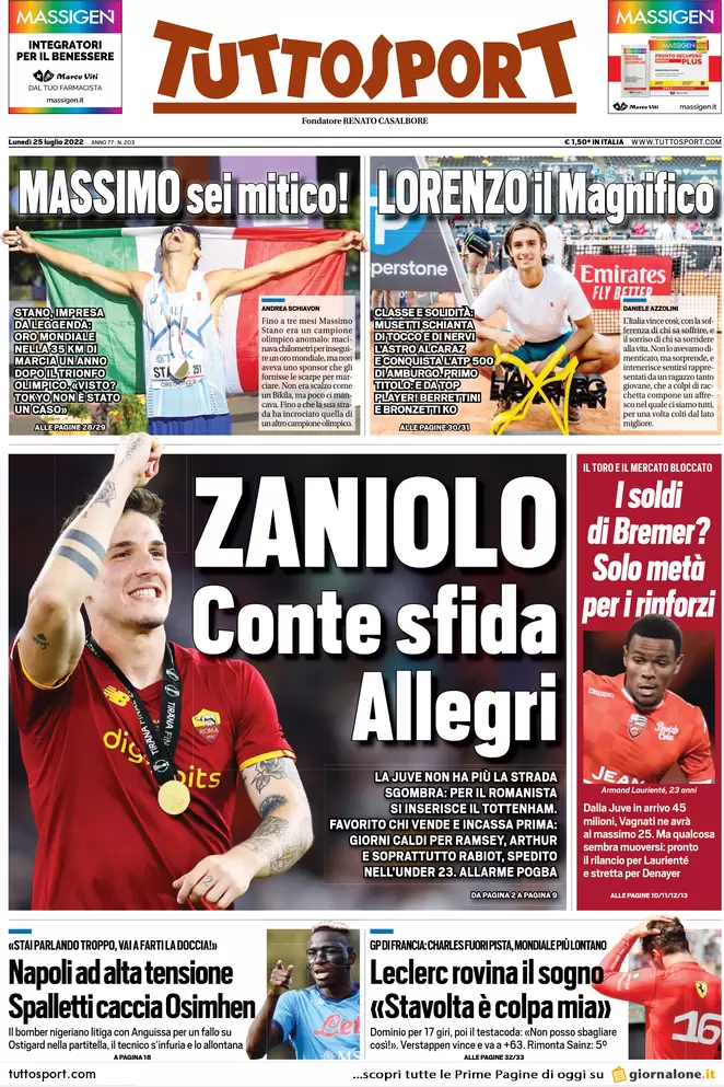 Ecco le prime pagine di Gazzetta dello Sport, Corriere dello Sport e Tuttosport in edicola oggi, lunedì 25 luglio