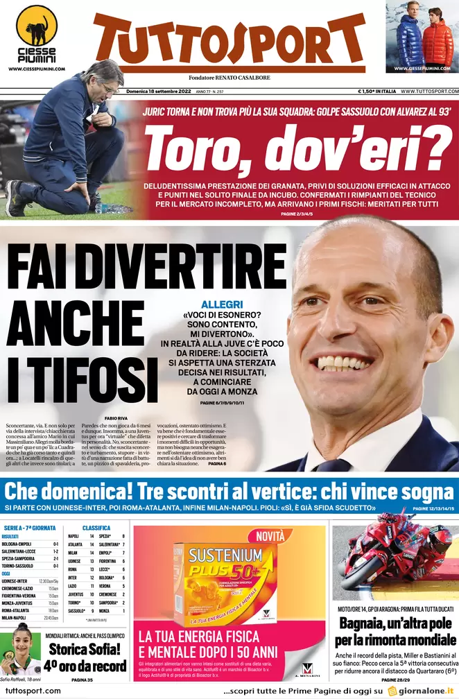 Di seguito le prime pagine di Gazzetta dello Sport, Corriere dello Sport e Tuttosport in edicola oggi, domenica 18 settembre.