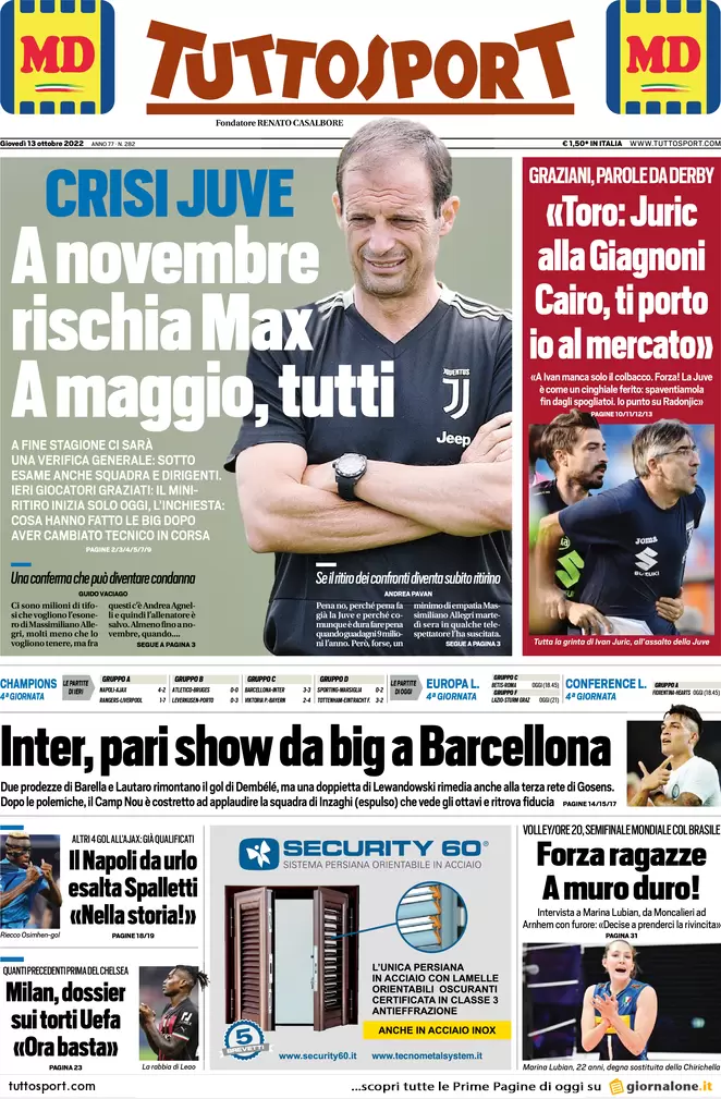 Le prime pagine dei principali quotidiani sportivi questa mattina in edicola