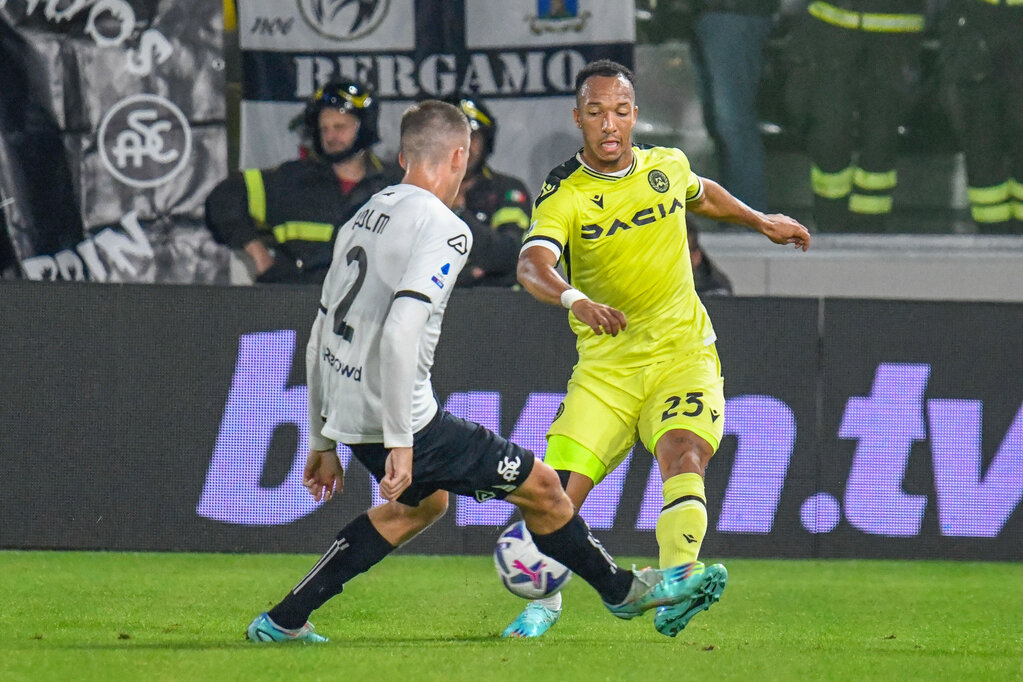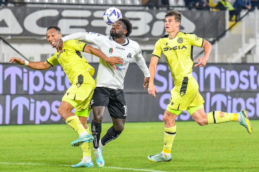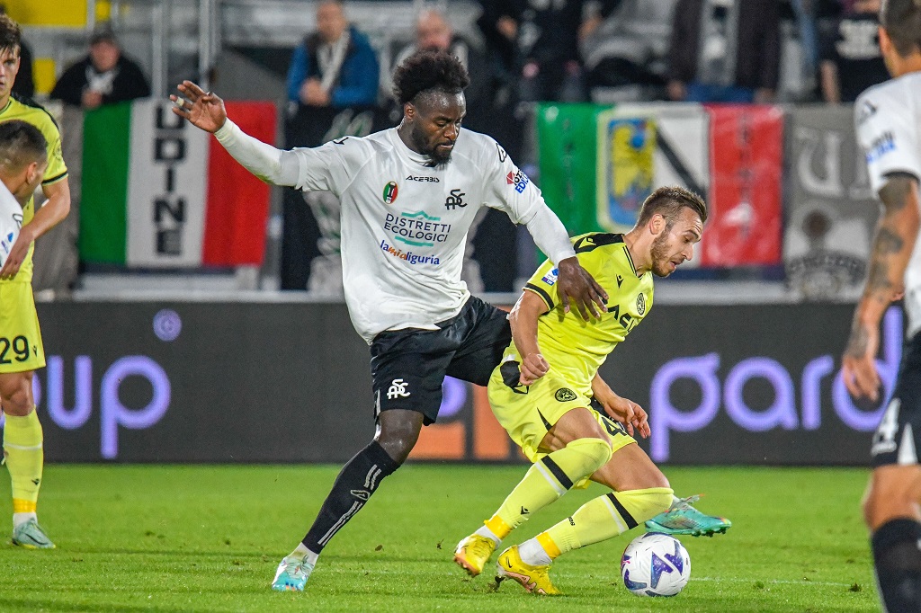 Spezia's M'Bala Nzola and Udinese's Enzo Ebosse