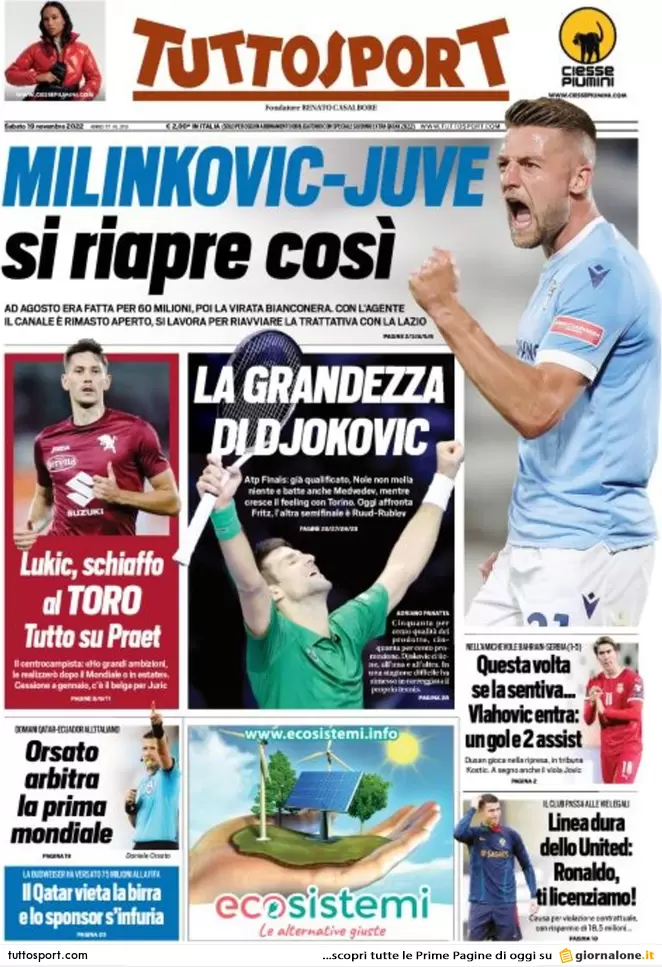 Di seguito le prime pagine di Gazzetta dello Sport, Corriere dello Sport e Tuttosport in edicola oggi, sabato 19 novembre.