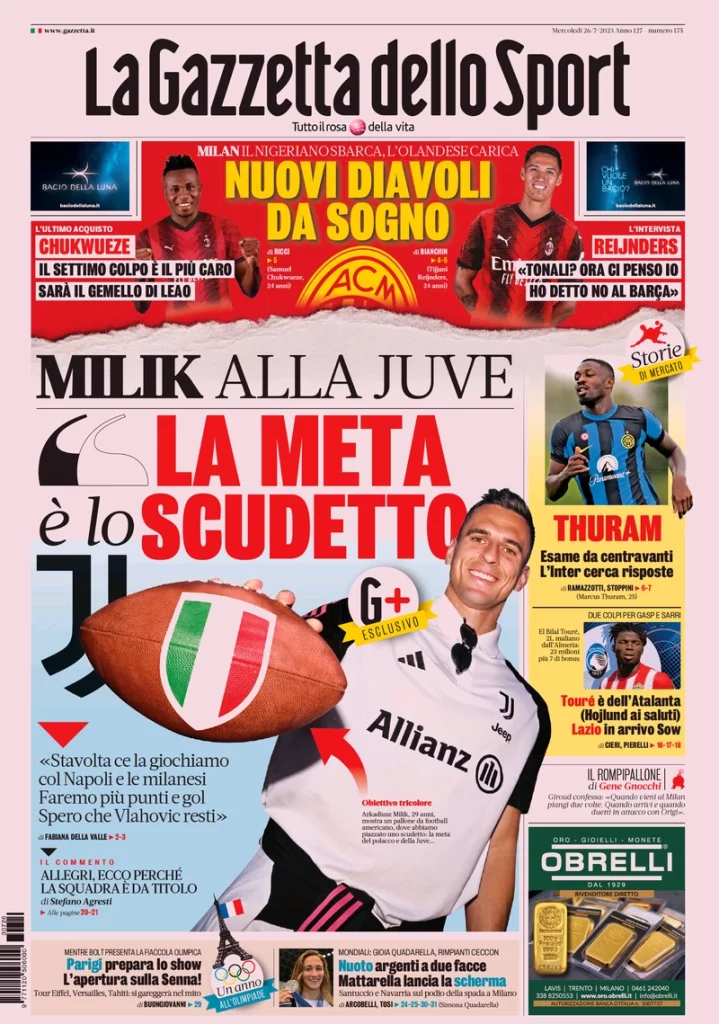 Le prime pagine dei principali quotidiani sportivi nazionali in edicola questa mattina