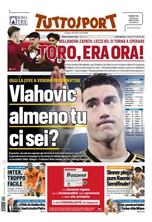 La fuga solitaria dellāInter e la Juventus oggi in campo a Verona si prendono le copertine odierne dei maggiori quotidiani...