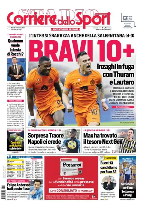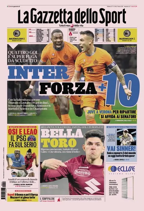 La fuga solitaria dell’Inter e la Juventus oggi in campo a Verona si prendono le copertine odierne dei maggiori quotidiani sportivi nazionali.